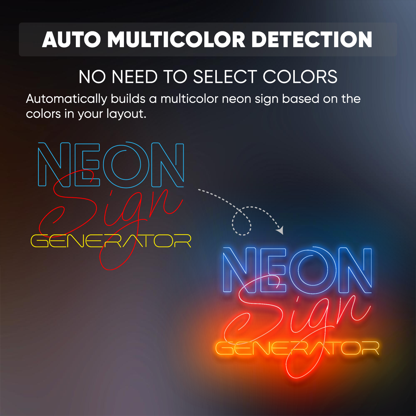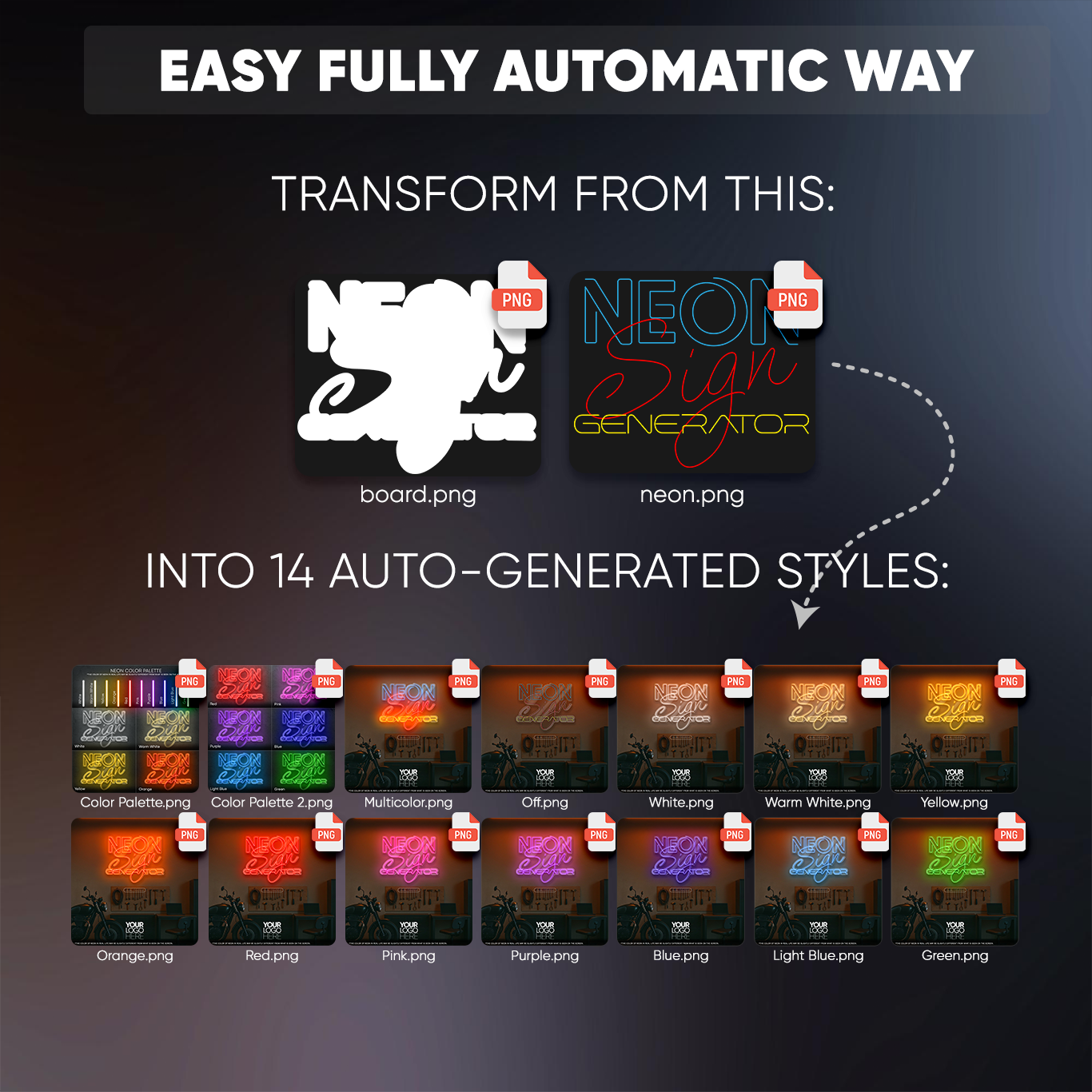 - Standart 10 Color Variations: Instantly generates 10 neon color versions using industry-standard color presets (White, Warm White, Yellow, Orange, Red, Pink, Purple, Blue, Light Blue, Green).